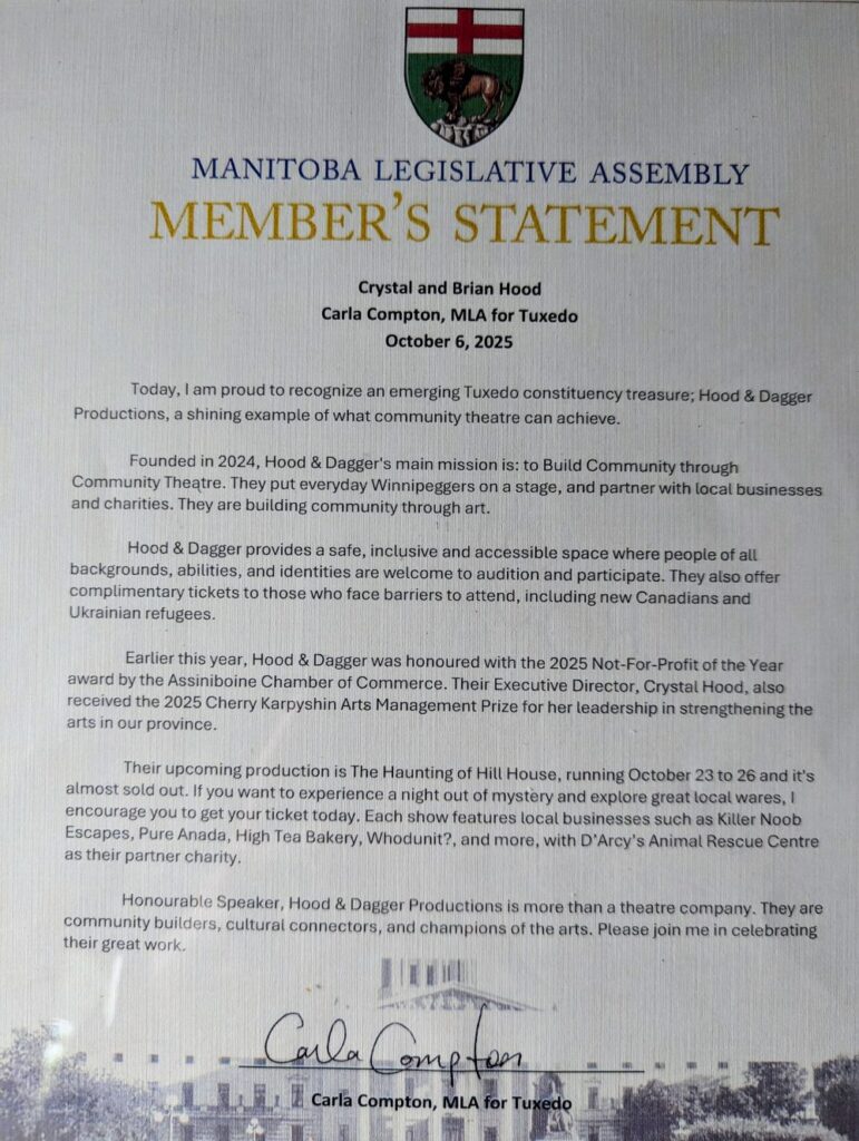 PRESS RELEASE: Hood and Dagger Productions recognized by the Government of Manitoba