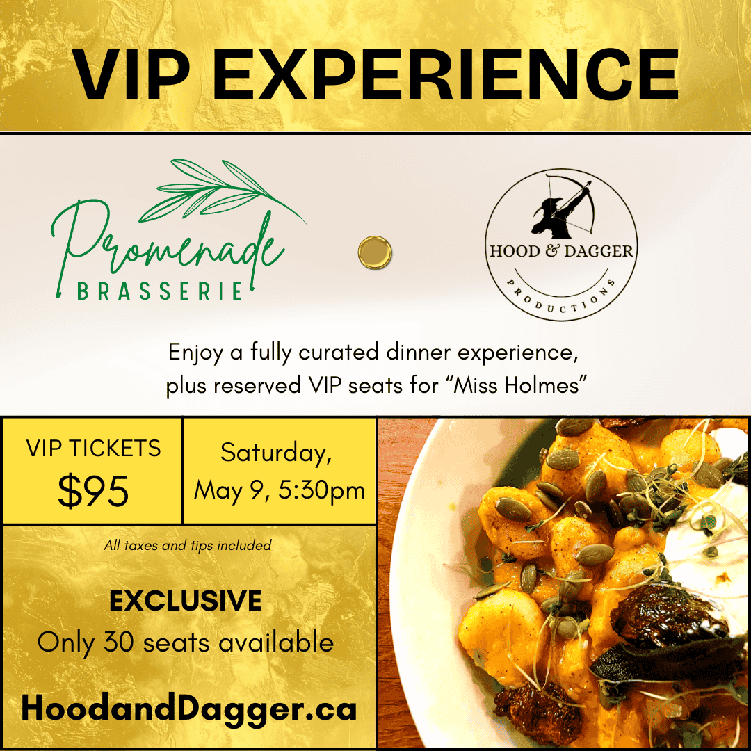 Hood and Dagger Productions volunteers will meet you at the Promenade Brasserie just before 7:00pm to escort you to the Saint Boniface University, Martial-Caron Theatre, which is about a 7-minute walk away. When you arrive, you will skip the Box Office line and enter the theatre to your specially-marked reserved seats. With a large set, 40+ Victorian costumes, an incredible cast and crew, and fantastic story, you’ll be on the edge of your seat throughout this fast-paced detective mystery.